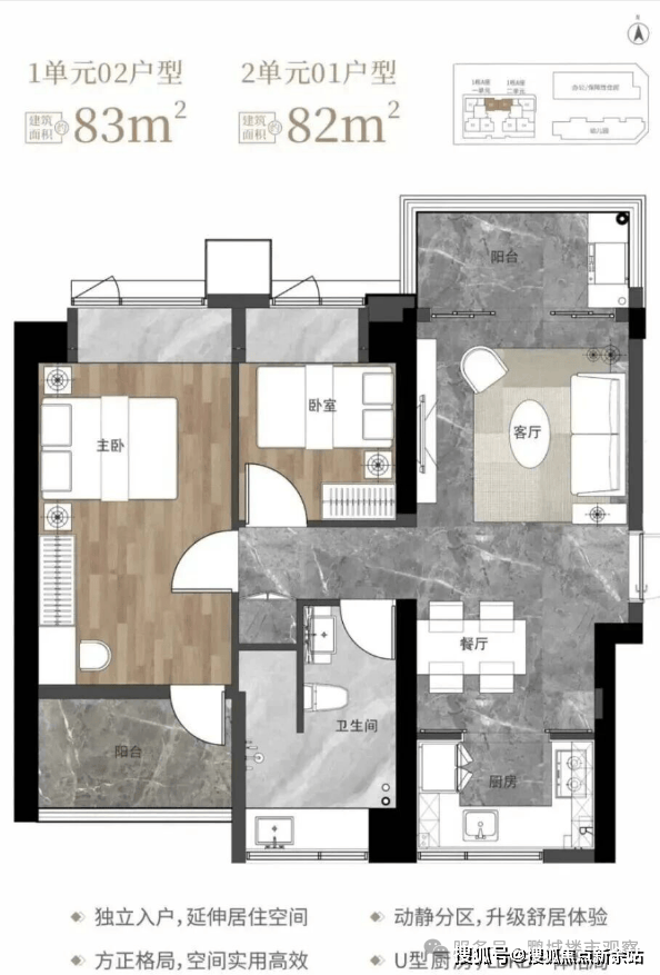 82-83㎡的3房2厅1卫,1栋1单元02户型/1栋2单元01户型,设计的是竖厅南北通透格局,独立入户,客厅3.2米开间,LDKB一体化设计,动静分区,南北双阳台,U型厨房,卫生间干湿分离,阳台正北朝向。