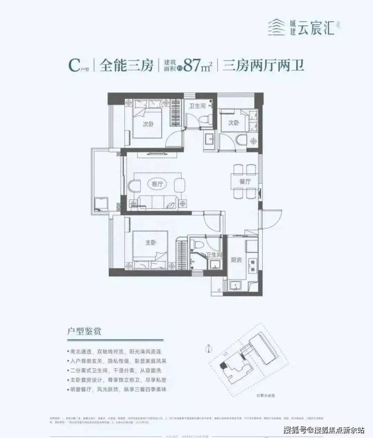 87㎡的3房2厅2卫,设计的双龙抱珠格局,餐客厅一体化,L型厨房,东南朝向。