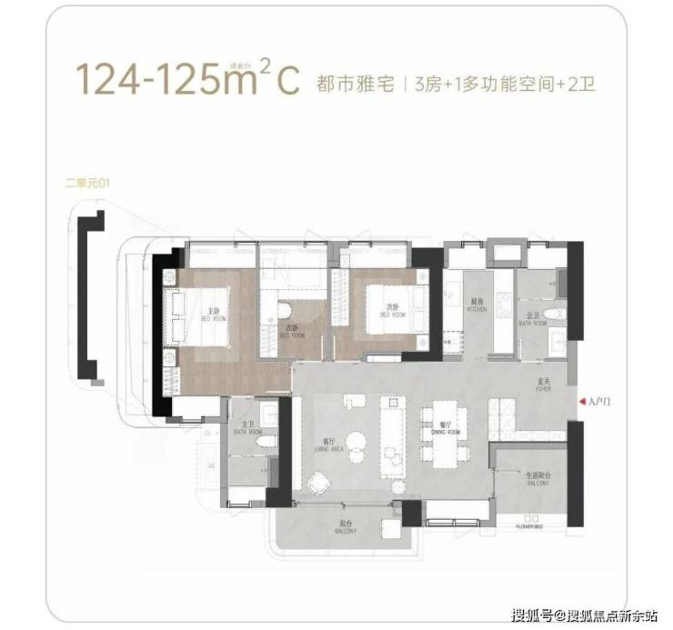 125㎡的4房2厅2卫,01户型,设计的是横厅南北通透格局,进门入户玄关,客餐厅6.4米开间,LDKB一体化设计,约5.4米进深南北通主卧,分别做到了主卧14.89m²/次卧9.36m²/次卧7.14m²/次卧3.96m²(实测面积,去掉墙体),U型厨房,卫生间干湿分离,得房率约71.7%(不含赠送),套内面积89.58m²,阳台主朝西北向。