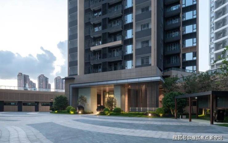 入户大堂采用简洁的L造型,营造半开放式的空间,主体运用石材、铝板和磨砂玻璃等现代材料营造归家的仪式感,两侧竖向格栅丰富外立面的层次感,同时引景入内,增加空间的趣味性。