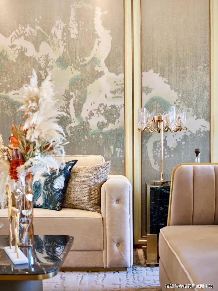 ✨鳄鱼皮编织纹墙布背景搭配鎏金翡翠奢石,通透飘逸,奢贵内敛。