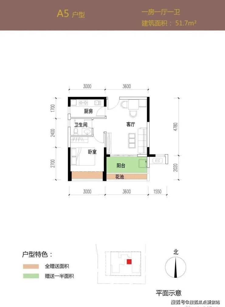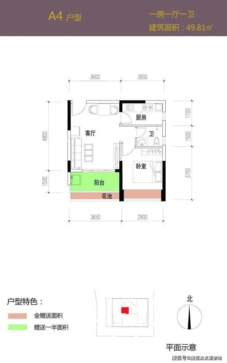 标准一房一厅户型,户型方正明厨明卫,3.6米左右客厅开间带有2米左右进深阳台宽敞舒适,可提供较好功能。主卧开间3米左右,拥有良好的开间进深比实用性能较佳。