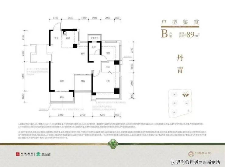89㎡的4房2厅2卫,设计的是经典竖厅格局,进门入户玄关,客厅3.45米开间,动静分区,三开间朝南,分别做到了主卧14.54㎡/次卧7.96㎡/次卧7.56㎡/次卧5.8m²(包含墙体飘窗),主卧+1个次卧270°飘窗,U型厨房,公卫三段式干湿分离,得房率约102.2%(包含赠送),阳台5.52m²西南或东南朝向。飘窗赠送面积13.17m²+阳台赠送面积6.61m²+设备平台1.8m²=实际赠送面积约21.58m²。