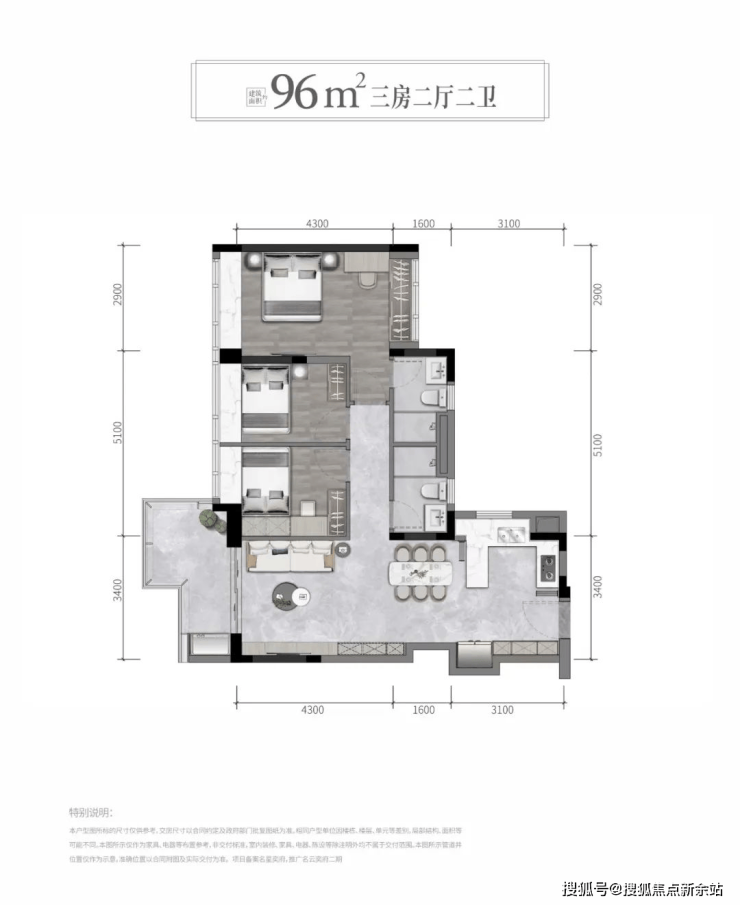 建面约96㎡的三房两厅两卫,则是三个房间和客厅均做到了朝南设计。同时,LDK一体通厅设计,拉近了家人间的亲密互动。