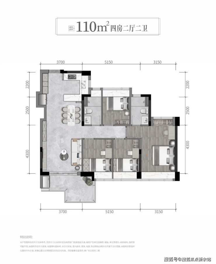 建面约110㎡的4房2卫,则是一步到位、改善家庭的首选。