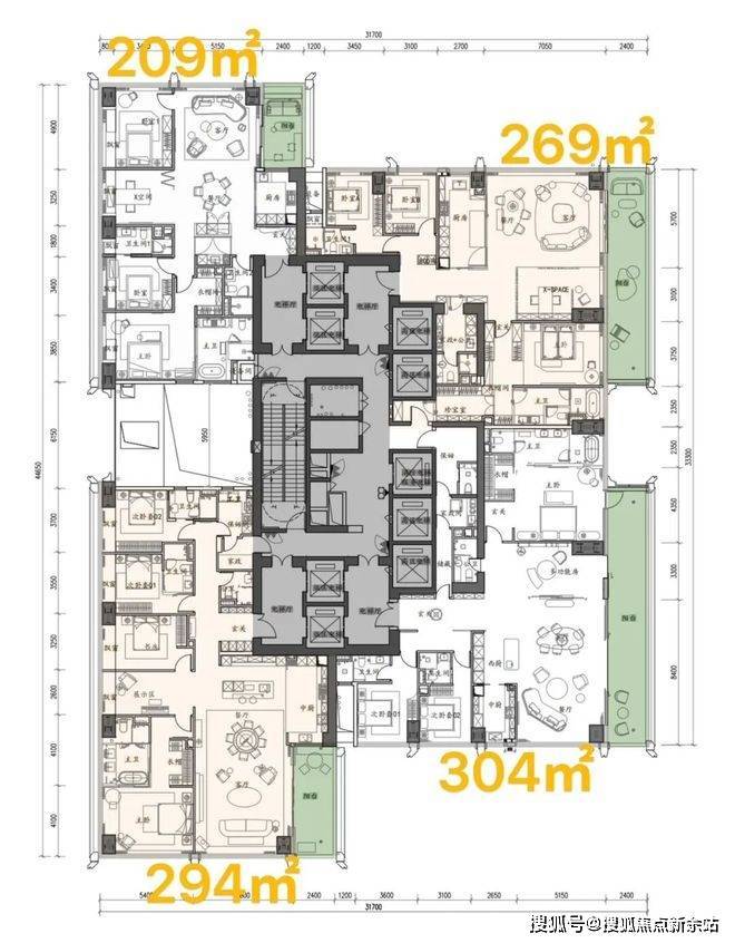 超高区(58层起,200米以上):约500-700㎡顶级大平层。