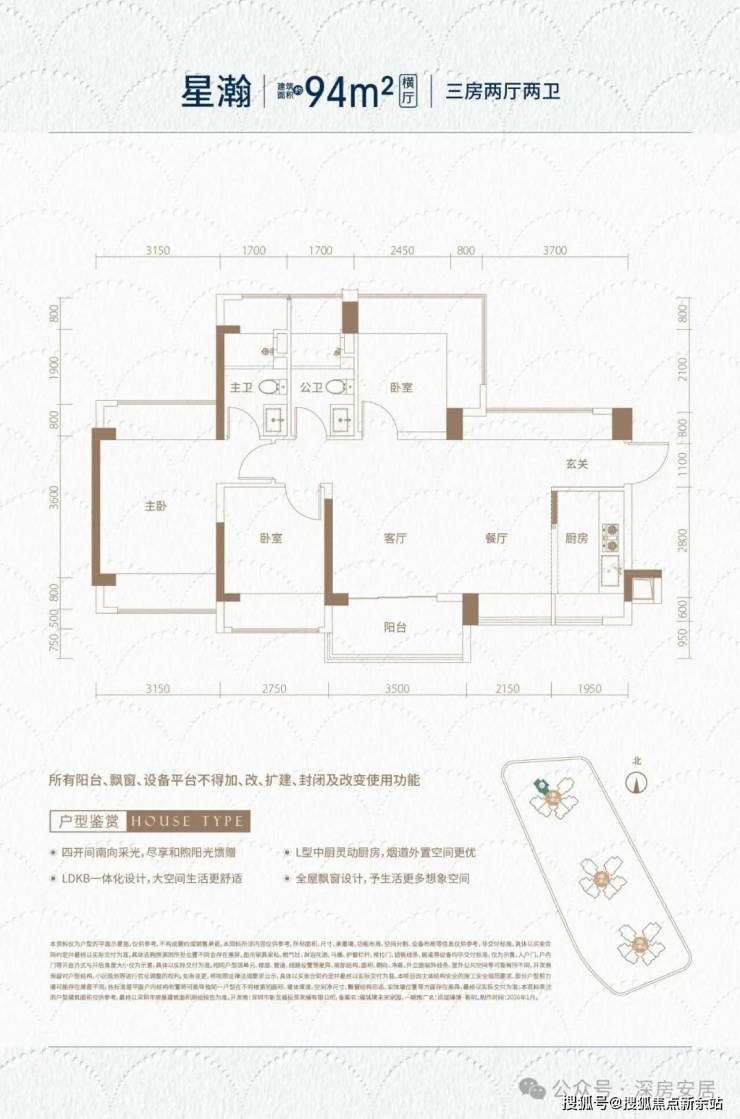 94㎡的3房2厅2卫(横厅),设计的是横厅南北通透格局,独门独户,进门入户玄关,客餐厅5.65米开间,LDKB一体化,全屋10面飘窗,主卧南北通,分别做到了主卧16.38㎡/次卧12.02㎡/次卧9.9㎡(包含墙体飘窗),L型厨房,卫生间干湿分离,得房率约105%(包含赠送),阳台约5.42㎡主朝西南向。