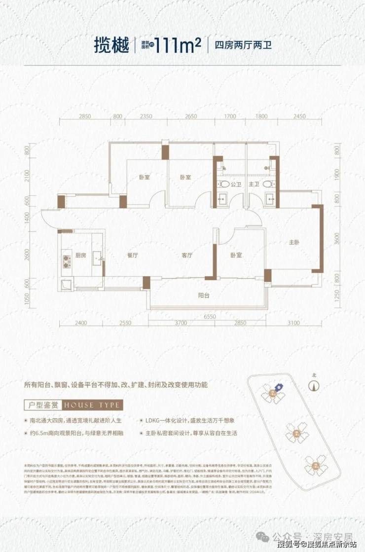111㎡的4房2厅2卫,设计的是横厅南北通透格局,独门独户,进门入户玄关,客餐厅6.25米开间,LDKB一体化,全屋10面飘窗,主卧南北通,分别做到了主卧16.6㎡/次卧10.54㎡/次卧9.27㎡/次卧7.41㎡(包含墙体飘窗),U型厨房,卫生间干湿分离,得房率约102%(包含赠送),客厅连接次卧出6.55米长的大阳台,约10.8㎡主朝东南向。