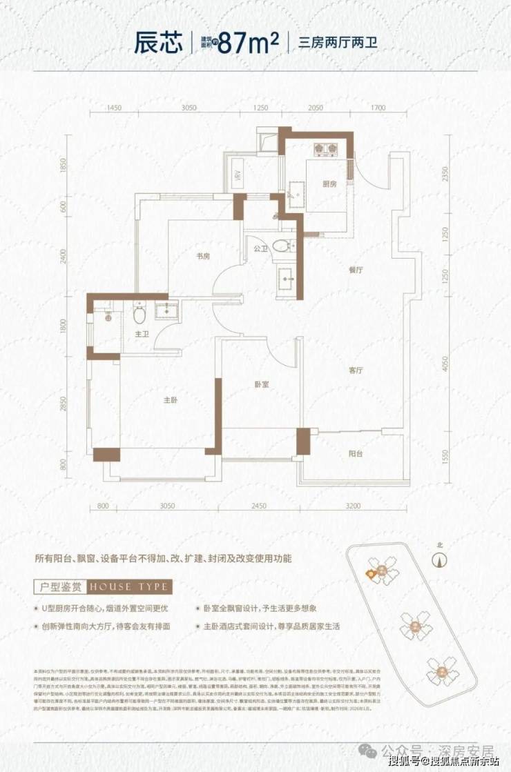 87㎡的3房2厅2卫,设计的是经典竖厅格局,进门入户玄关,客厅3.2米开间,LDKB一体化,S墙设计预留冰箱卡槽位,动静分区,三开间朝南,分别做到了主卧15.91㎡/次卧9.19㎡/次卧9.15㎡(包含墙体飘窗),U型厨房烟道外置,公卫三段式分离,还带1个设备平台,得房率约98.3%(包含赠送),阳台约4.96㎡西南朝向。