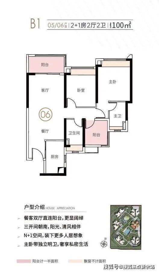 此外,建面约100㎡2+1房2厅2卫,做到了三开间朝南,整体更为开阔。