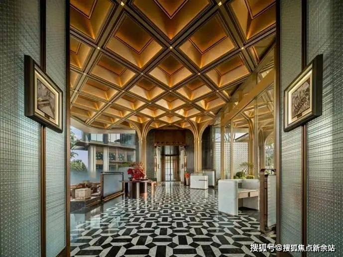 以上海宝格丽酒店为范本,为酒店式大堂营造出富丽堂皇的奢雅质感。大堂会客厅采用下沉式设计,这种设计的好处是,可以与园区景观实现更亲密的对视,能够沉浸式坐赏水院碧澜。