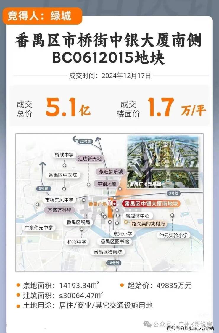 2024年12月17日,绿城(广州西溪投资发展有限公司)以5.08亿元拿下番禺区市桥街中银大厦南侧BC0612015地块。
