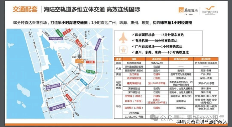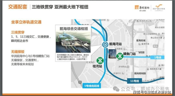 前海综合交通枢纽距离本项目仅一站地铁之遥。五条轨道交通线路贯穿项目,包括深港西部快轨(具备口岸功能)、穗莞深城际线、地铁11号线、5号线、1号线,充分体验前海的交通便利。
