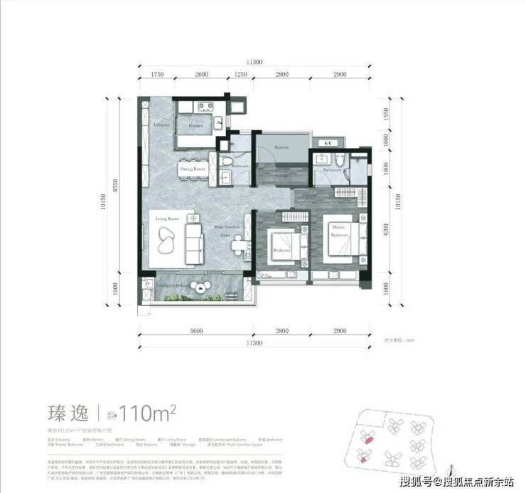 建面约𝟏𝟏𝟎m²户型【可改四房】,全开间朝南 约𝟏𝟏.𝟑米南向采光面