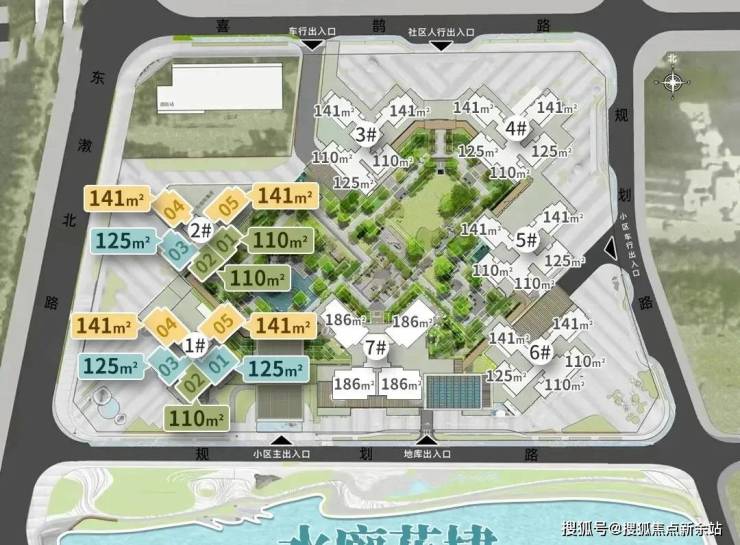 户型:建面约𝟏𝟏𝟎-𝟏𝟖𝟎 ㎡南向滨水三四房