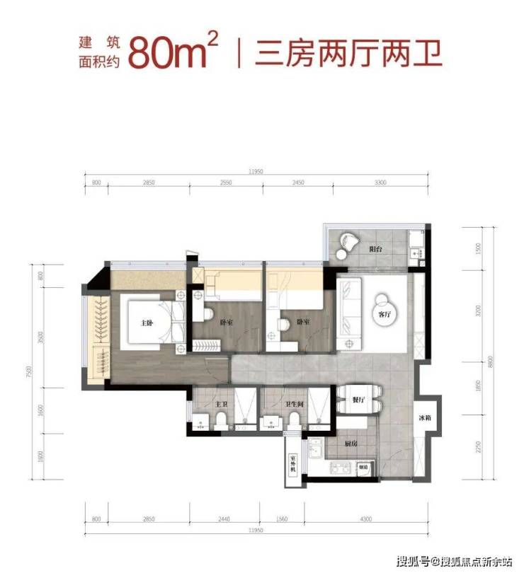 【建筑面积80㎡3房2卫】