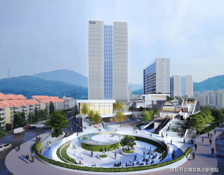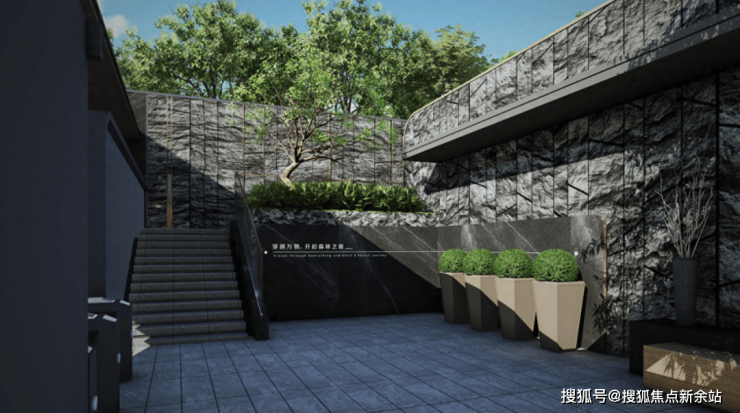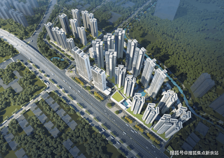 小区的空间布局遵循“一纵一环九节点”,整体为现代化简约风格,结合周边珍贵自然资源,设计理念融合山色与流水概念,创造以“流动 的森林”为主题的园林。