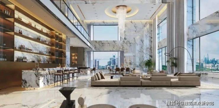 · 入门,是豁然开朗的复式格局。 挑高约6米的阔绰客厅,打造出宫殿般的空间感与仪式感。光影透过巨幅落地窗倾泻而下,在空间中自由流淌、舞蹈,完美诠释了“空中墅居”的非凡气度。