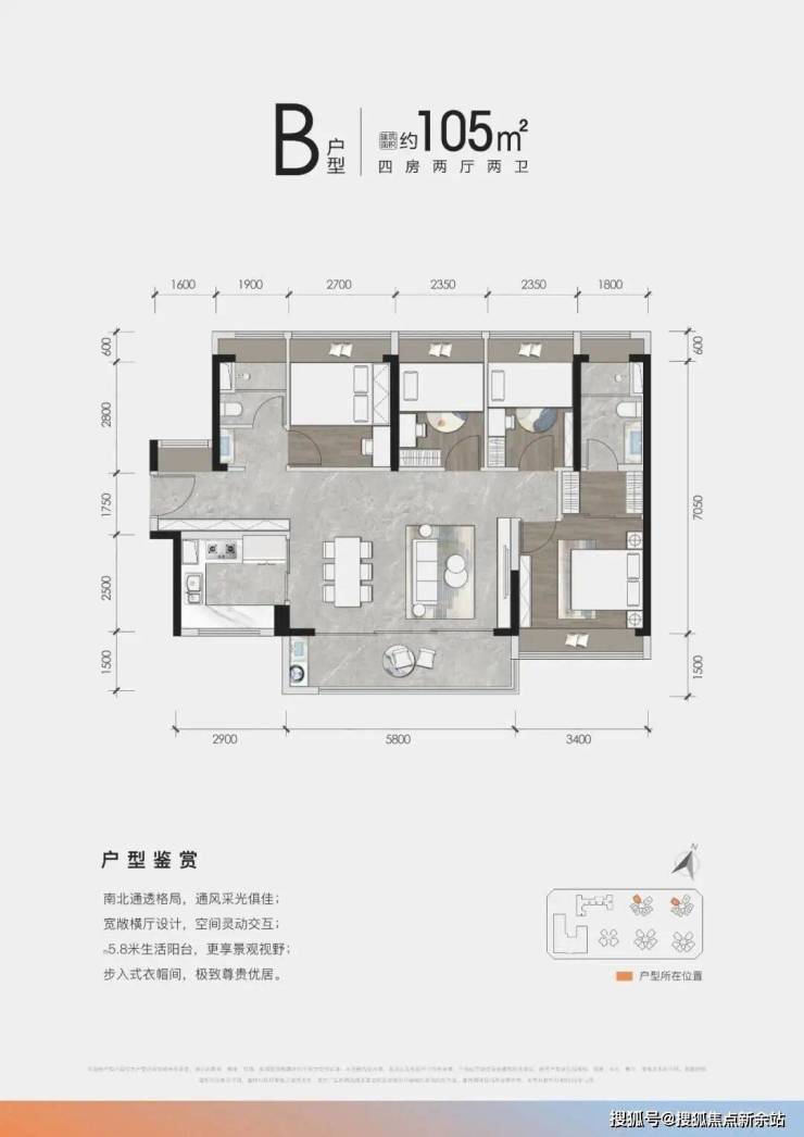 户型面积布局2105平四房两厅两卫采用横厅设计,打造餐客厅+阳台一体化,于1+1>2的效果赋予空间更大想象,扩展家庭活动区域的同时,也提升整体空间通风及采光性,会客待友、休憩娱乐均可轻松满足,让家人的幸福指数直线上升。