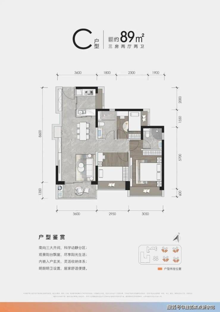 户型面积布局189平三房两厅两卫奢阔餐客一体,采用竖厅设计,并相连观景阳台,缔造视野的大开间格局,采光通风俱佳,在阳光清风间轻松对望天地风景。