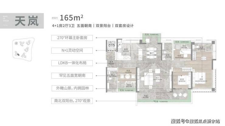 建面165平4+1房大平层,双阳台南北对流,四开间朝南,中式厨房+独立西式岛台,三面望山景,朝南面宽达到17.4米,近9米的L型景观阳台,双主套设计,南北对流,主卧同样270度折叠屏飘窗