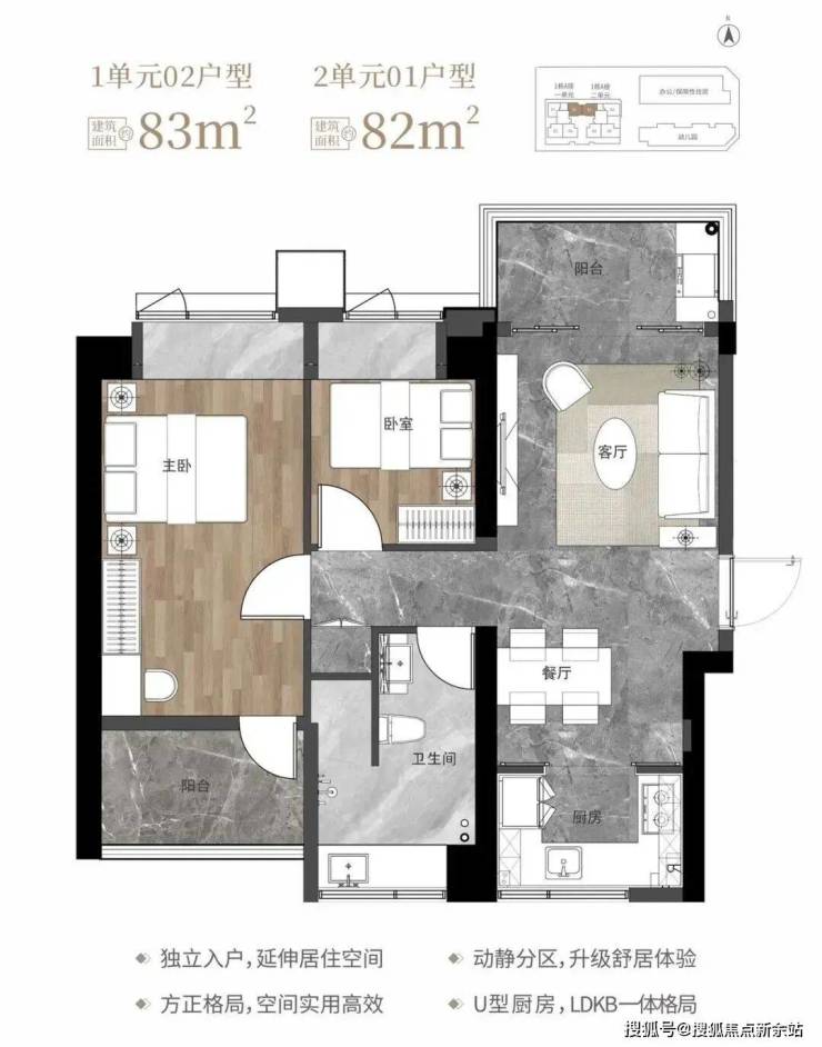 82-83㎡的3房2厅1卫,1栋1单元02户型/1栋2单元01户型,设计的是竖厅南北通透格局,独立入户,客厅3.2米开间,LDKB一体化设计,动静分区,南北双阳台,U型厨房,卫生间干湿分离,阳台正北朝向。