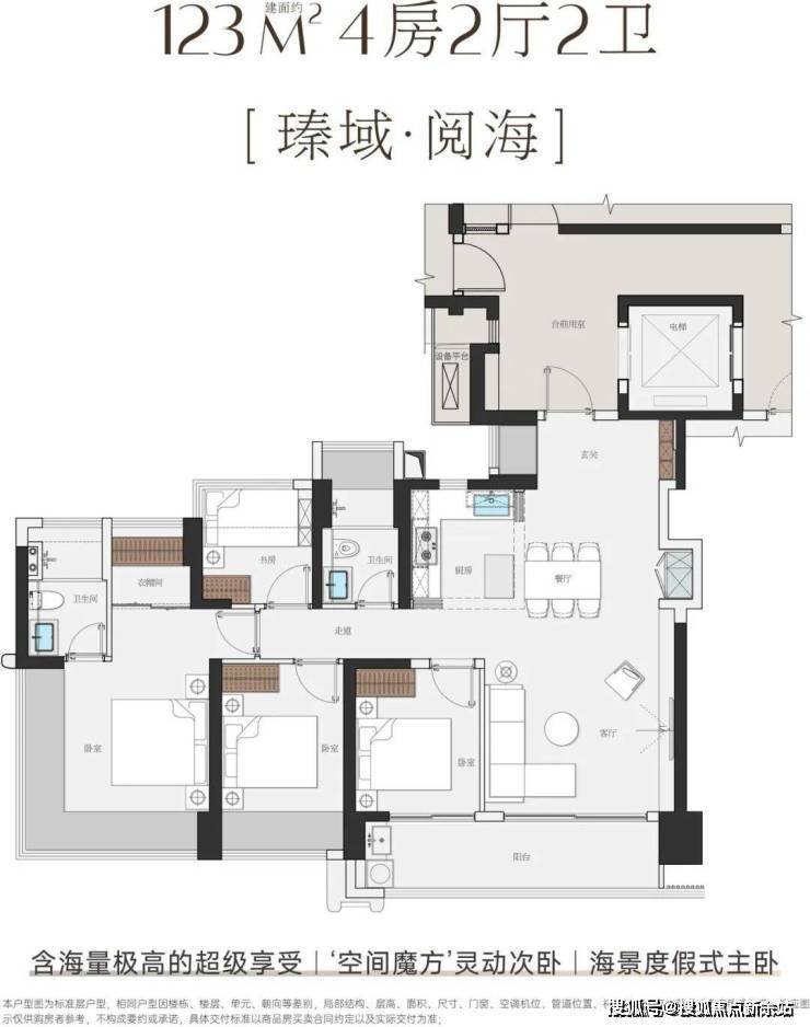 4梯5户带独立电梯厅,面积为114-122-138-143㎡,最大使用率108%,最大赠送面积接近44㎡。