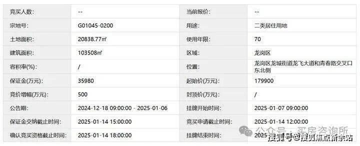 龙岗,位于龙岗区龙城街道龙飞大道和青春路交叉口东北侧,土地面积20838.77㎡、建筑面积103508㎡,规定容积率≤4.97,土地用途为“二类居住用地”,以起始价179900万元挂牌出让。
