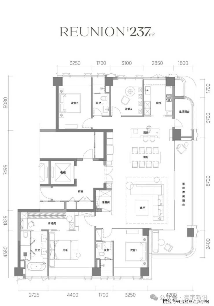 •尺度革新:建面约197m²户型,专梯入户设计。户型格局极致方正,动静分区清晰,实现了三面采光与双南向套房的“双龙抱珠”格局。