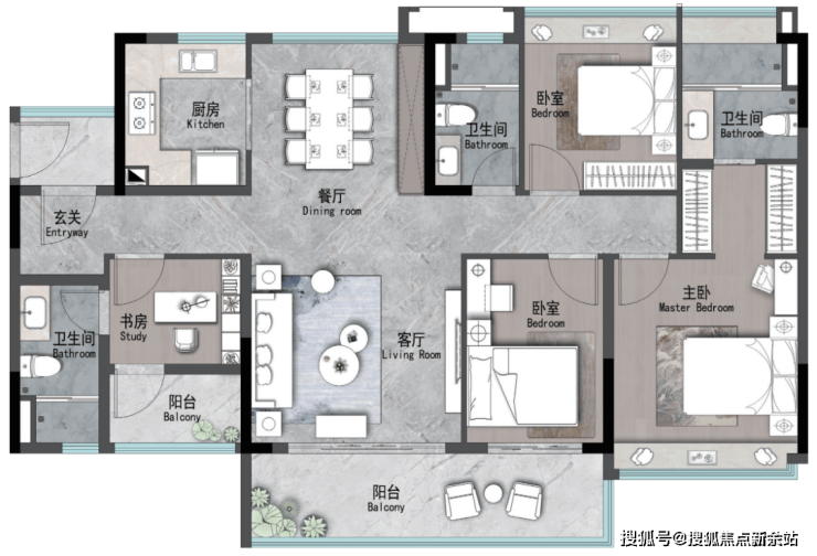 建面约107m² | 四房两厅两卫:提供了更多的私人空间,适合追求舒适生活的家庭。