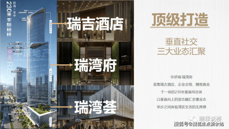 华侨城·瑞湾府承袭华侨城品牌理念,以前海封面标杆建筑,携手百年奢华瑞吉酒店,集合多重业态,为城市塔尖铸造一处生活向往之地,致敬城市人物高阶想象。