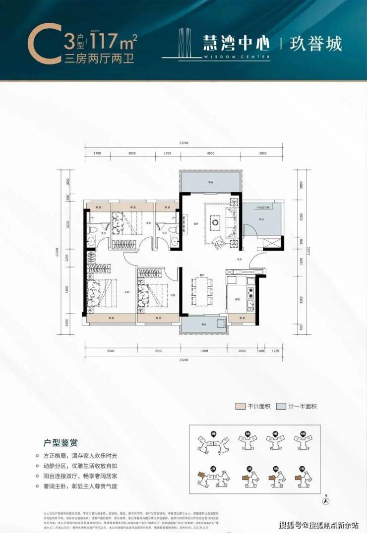 建面约111-117㎡阔景三至四房,方正户型格局,双厅一体相连;动静分区,畅享奢阔居家;户型南北通透,俯瞰园区中轴景观;全明采光,连通布局;景观阳台,独立书房。