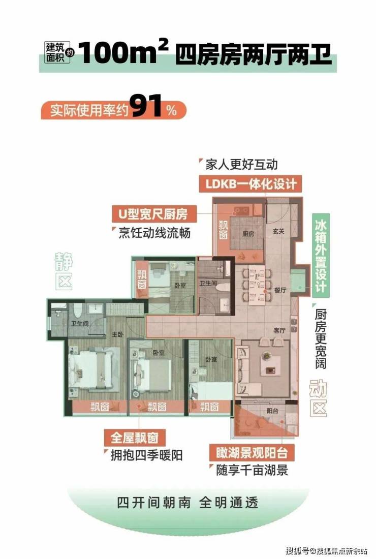【100㎡四房两厅两卫】• 同等面积多一房• 实际使用率约91%• 东南朝向 看湖看景