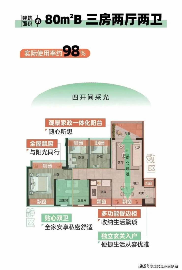【80㎡三房两厅两卫】-B户型• 同等面积多一卫生间• 实际使用率约98%• 南北通透 动静分区