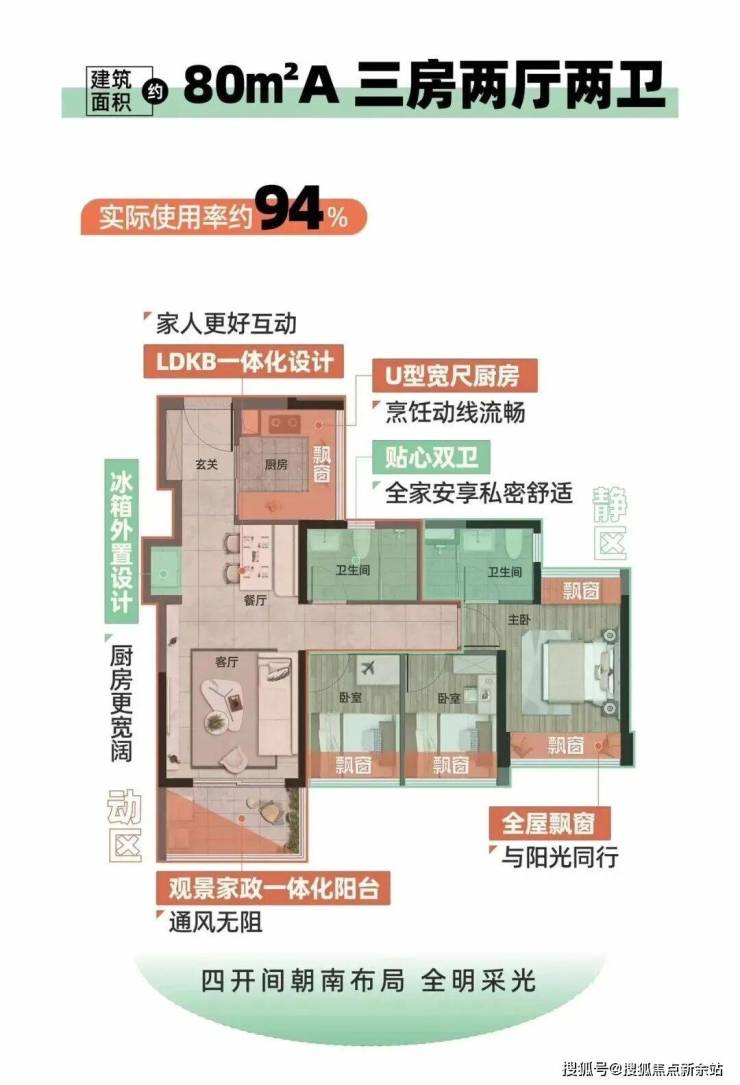 【80㎡三房两厅两卫】-A户型• 同等面积多一卫生间• 实际使用率约94%• 客餐厨一体化设计 动静分区