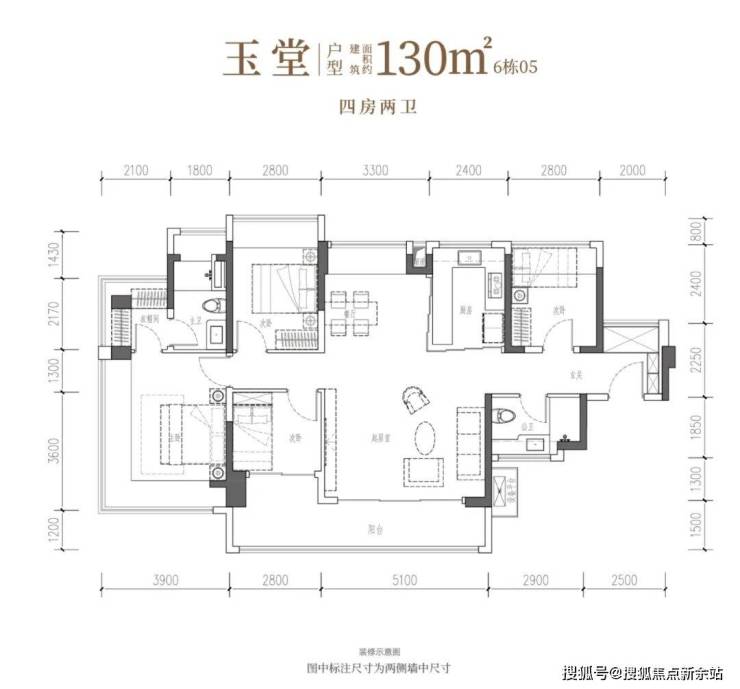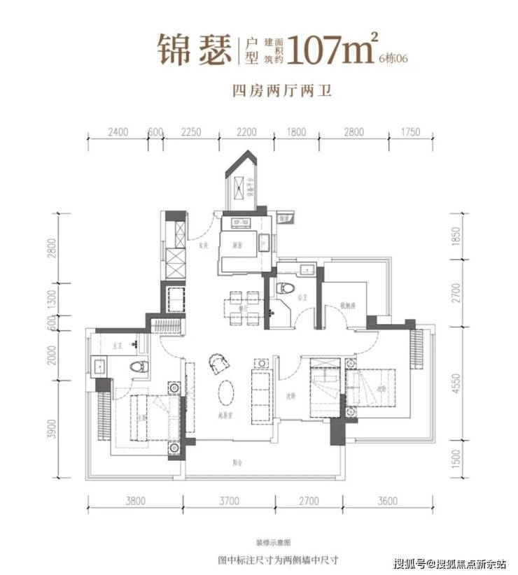 双龙抱珠设计,客厅面宽3.7米,四开间朝南,主卧和两个次卧有转角飘窗。得房率约104.06%(含赠送),客厅连接约11.76㎡超大阳台,朝向东北。