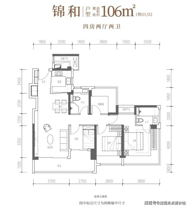 双龙抱珠设计,客厅面宽3.7米,四开间朝南,主卧和两个次卧有转角飘窗。得房率约104.06%(含赠送),客厅连接约11.76㎡超大阳台,朝向东北。