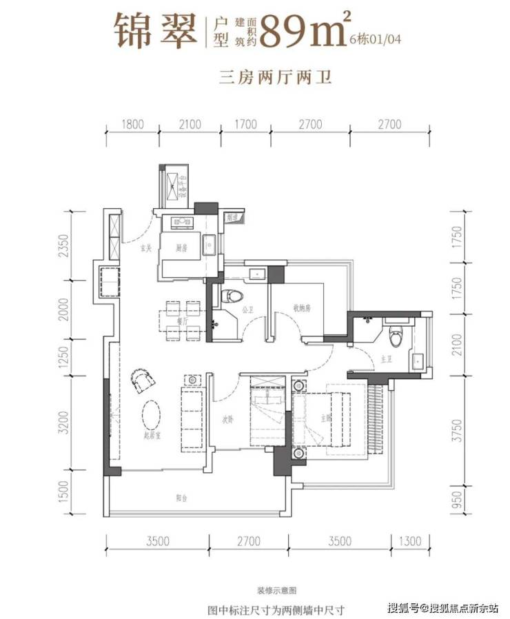 户型(01/04、02/03)采用竖厅设计,客厅面宽3.5米,三开间朝南,主卧和一个次卧有转角飘窗。