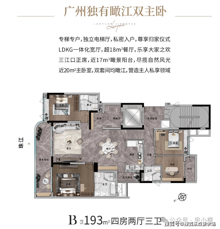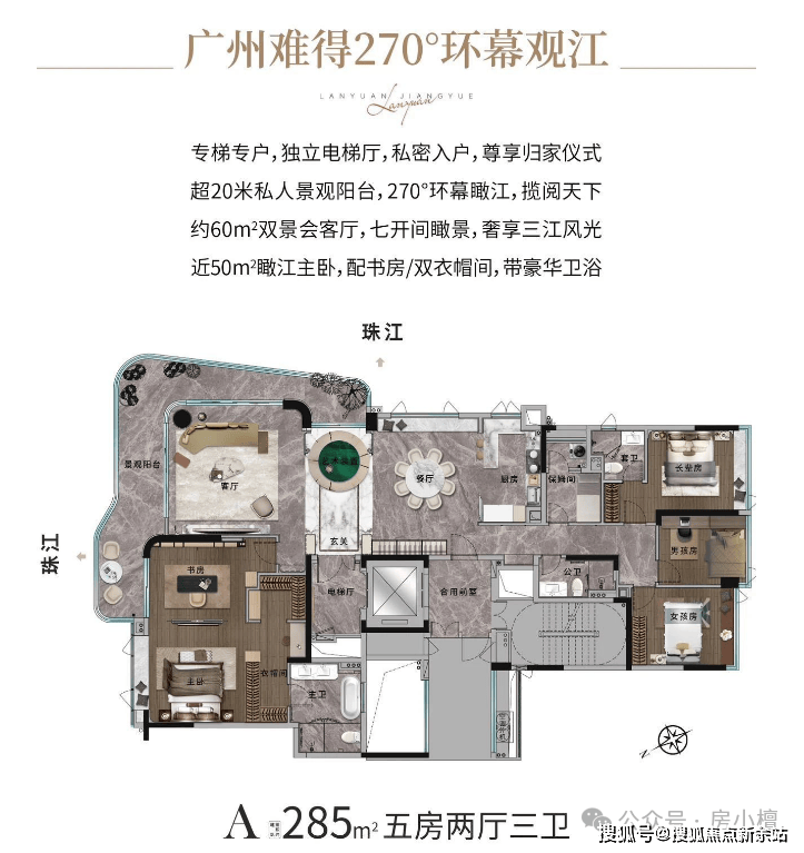 户型设计:所有户型均为专梯入户+江景单位,户型面积193㎡和285㎡,充分展现了白鹅潭顶级江景的魅力。