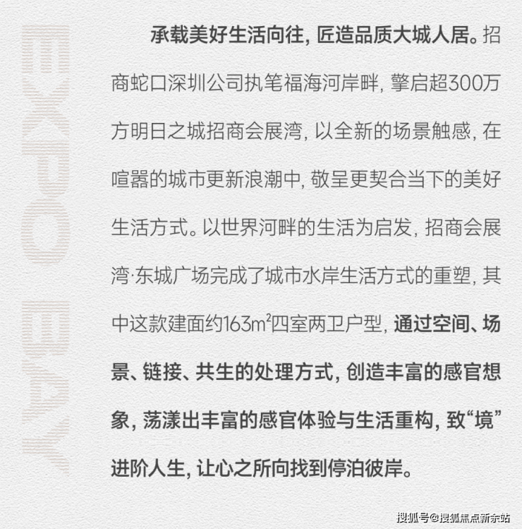 深圳宝安会展湾・东城,占位太绝!紧挨着深圳全新世界级展馆 —— 深圳国际会展中心,一边是都会繁华,一边是诗意栖居。项目自身打造约 3.5 万㎡现代艺术园林,开窗就是一线滨水风光,下楼便能邂逅四季全时美景。作为片区里独树一帜的高品质纯粹住区,更以匠心品质,把湾区时代的会展都会质感生活完美诠释!