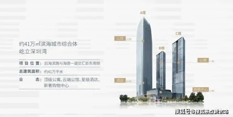项目总占地约2.5万㎡,总建面41万㎡,包含三栋超高层建筑(最高310米)及下沉式商业,是深圳湾片区稀缺的地标性物业。定位为集超甲级写字楼、高端公寓、都会商业于一体的滨海城市综合体。