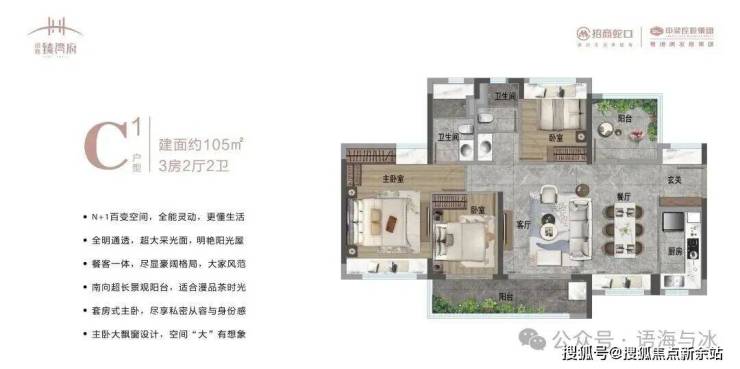 105㎡3+1房:南北双阳台设计,南向6米景观阳台,主卧套房带独立衣帽间,改善升级首选。