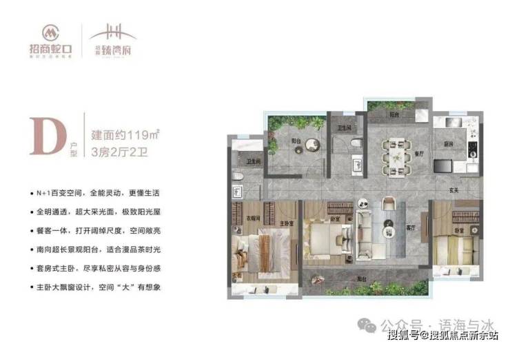 119㎡4房:4开间朝南,双卫设计,47㎡可变空间满足茶室、健身房等个性化需求,三代同堂不拥挤。