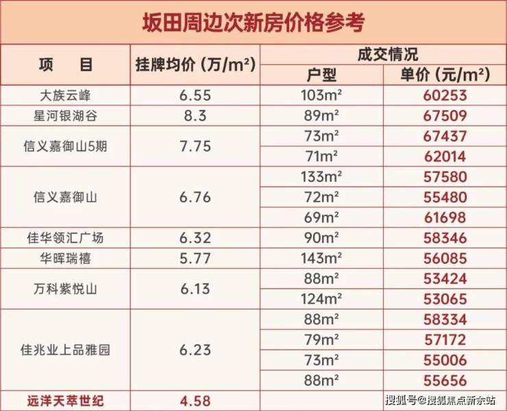 坂田目前次新房的价格挂牌价基本在6-7万/㎡区间,成交价5-6万/㎡,比远洋天萃相比高8000+元/㎡(用次新房最低成交单价53065元/㎡计算)的价差。