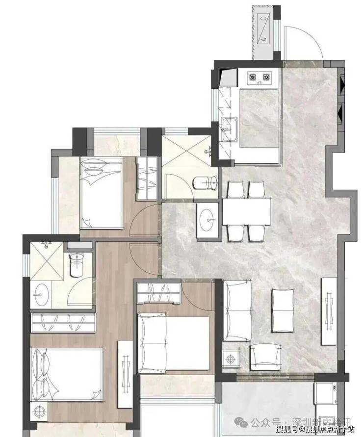 约89㎡横三房两位卫,此户型是横厅、通透、动静分区结构,在5种户型里面我认为它的优势最明显,当然,它也有缺点,主要体现在客厅阳台视野会被临近户型楼体外立面遮挡一部分。