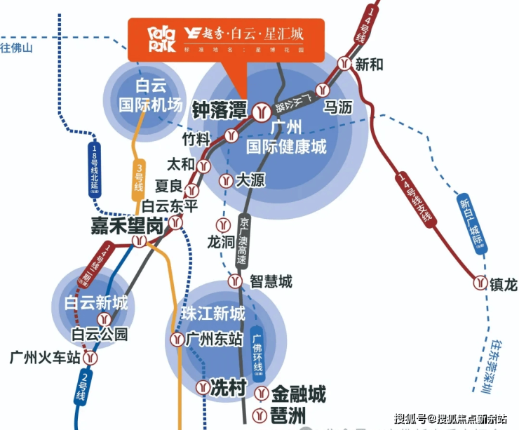 越秀·白云·星汇城项目位于地铁14号线钟落潭站旁,5站到嘉禾望岗,换乘2、3号线可直通白云新城和畅达广州全城;14号线二期(在建中)不换乘直达广州火车站;18号线北延段(在建中),在白云东平站与14号线交汇,7站即可到冼村。