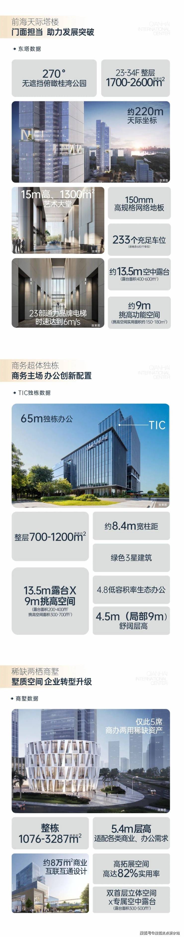 前海惟一总部集群,约1.2万-2.5万㎡空中叠栋总部约10345㎡独栋办公,一企一栋,约1076-3287㎡稀缺商墅,准现楼约94-224㎡总部私寓