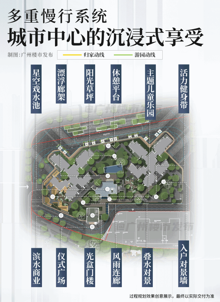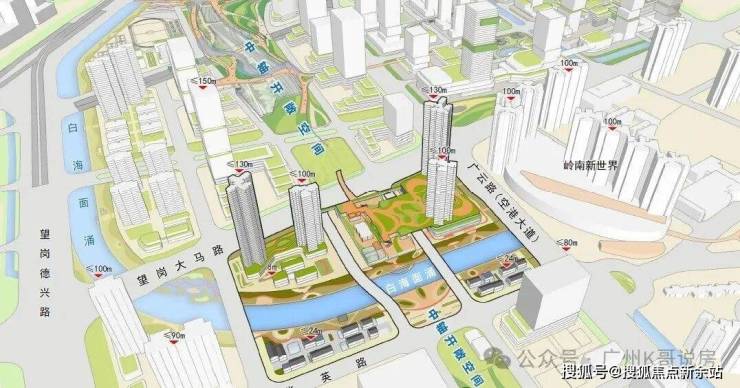 将采用“水岸共生”理念,以白海面涌为生态主轴,构建滨水慢行廊道。同时沿嘉禾望岗上盖设施打造景观化中轴公园,塑造片区创意活力。(非项目配建,以政府官方公示为准)