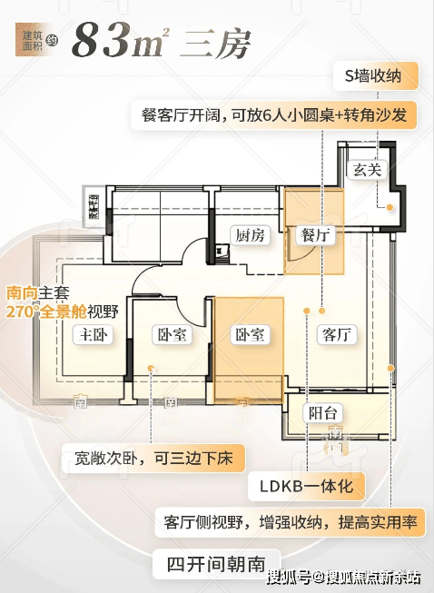 建面约83㎡,南向三房两卫。