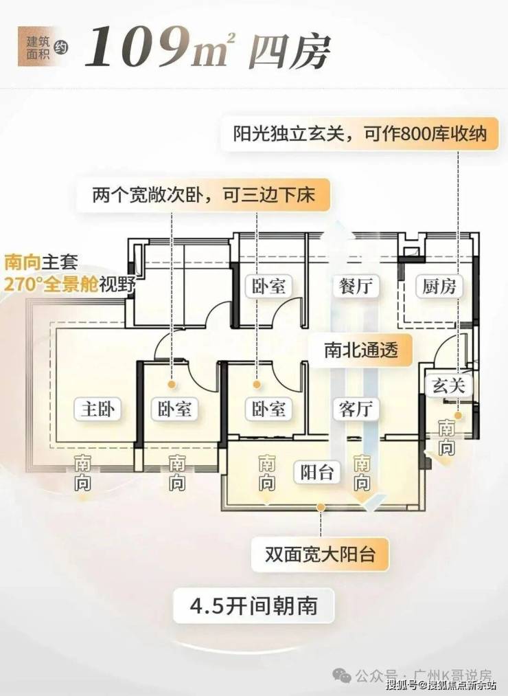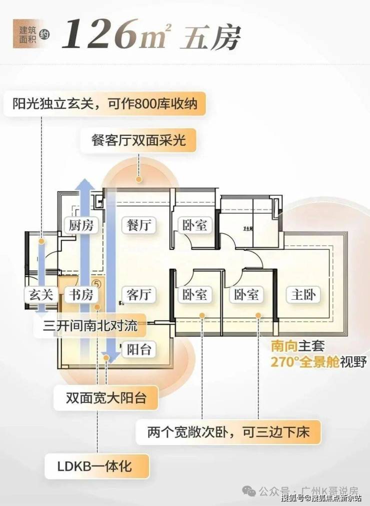 5,户型设计为新规户型,赠送率较高,参考越秀云悦的户型,88㎡户型能做到四空间配置,四开间朝南,主卧和一间次卧都有270°的大面转角飘窗;105㎡户型全屋4-4.5面宽朝南,客餐厨空间做到南北对流,而且餐厅一侧也带有大面宽的飘窗。